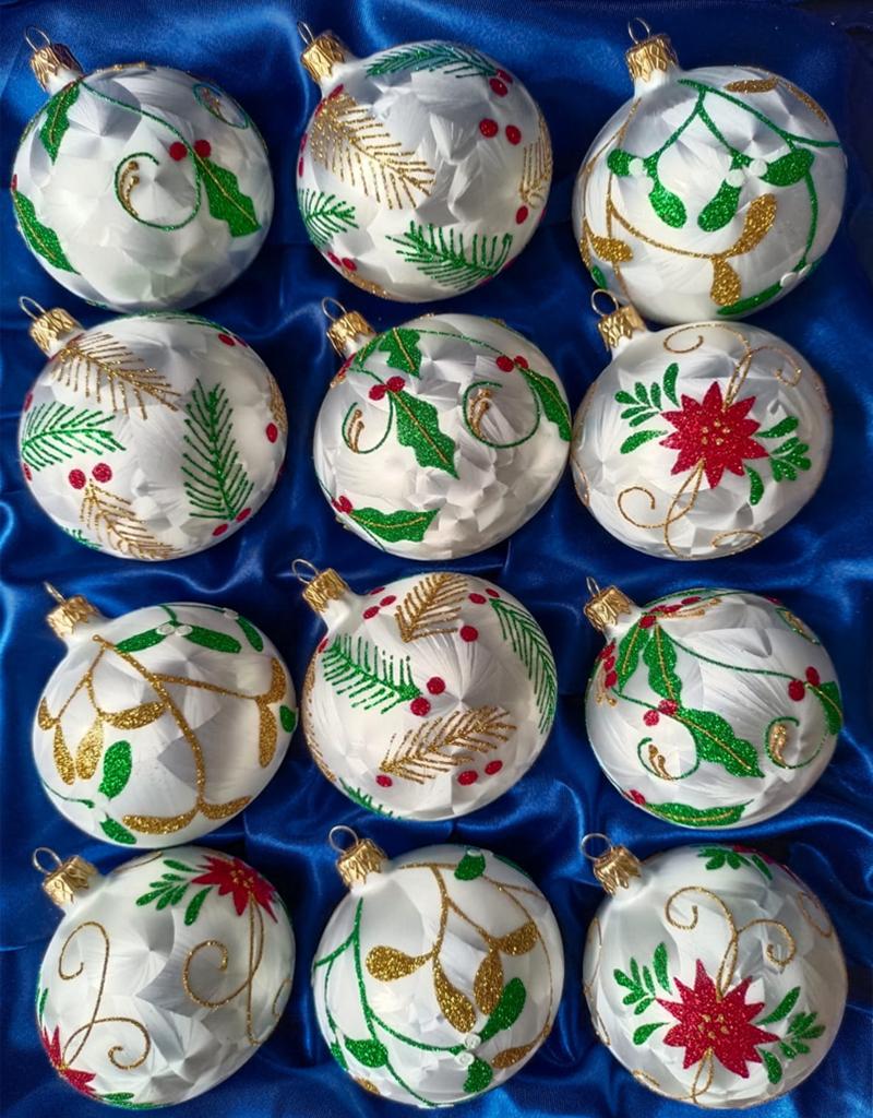 Tyto kouzelné koule mají průměr 8 cm, což znamená, že budou perfektně zapadat na váš vánoční stromek. Ať už máte malý, nebo velký stromek, naše vánoční koule vytvoří nezapomenutelnou dekoraci díky mrazolakovému efektu, který je vytvářen speciálním lakem a každá koulička je tak jedinečná jako námraza. Mrazový efekt přidává ozdobám ve vašem interiéru kouzelný nádech. Na koulích jsou ručně namalované čtyři nejoblíbenější vánoční rostliny: jmelí, jehličí, cesmína a samozřejmě vánoční hvězda (Pryšec). Dekory kouliček jsou promyšleně kombinované v tradičních vánočních barvách - zlaté, zelené a červené. Tato kombinace vytváří neodolatelný sváteční vzhled, který okouzlí každého. Vaše vánoční ozdoby budou letos prostě úchvatné!